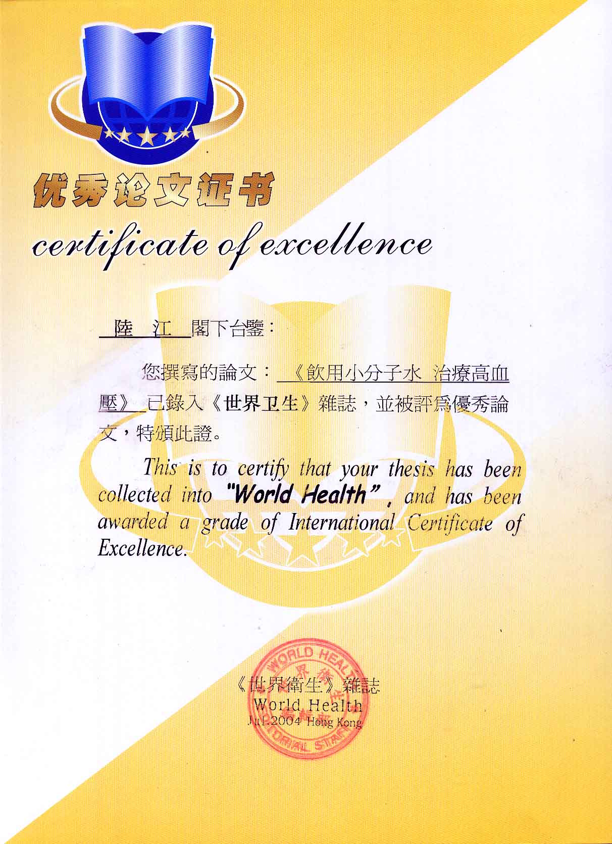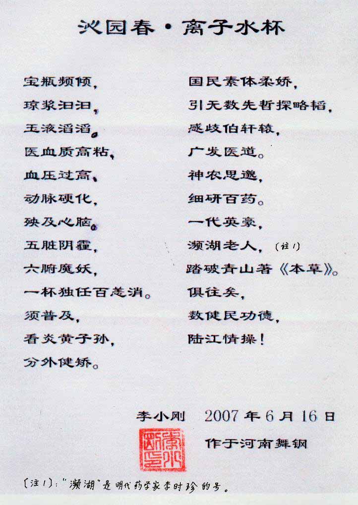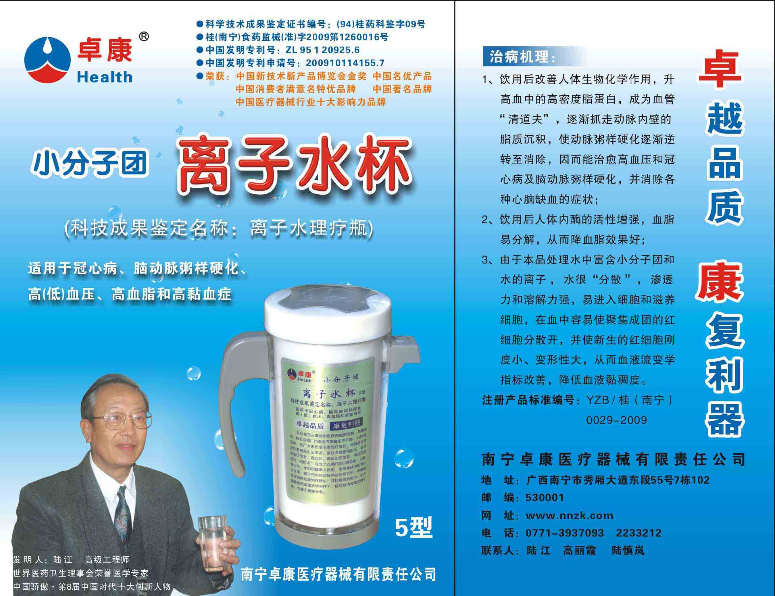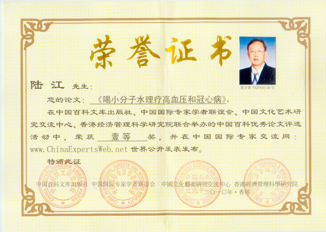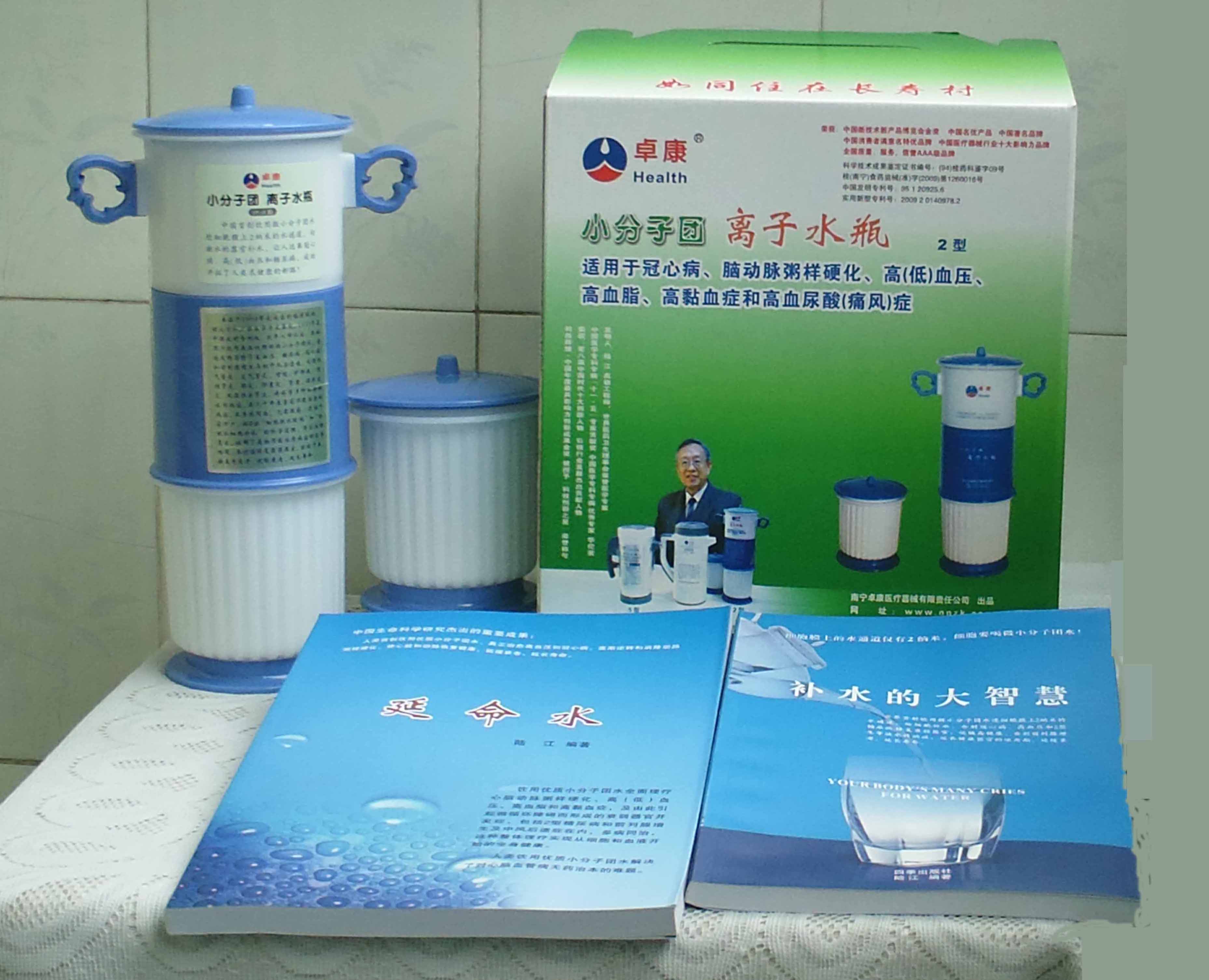 -----我是從事建筑的高工,本來沒有資格去攻克醫(yī)學(xué)難題,卻為了自身健康才扣響醫(yī)學(xué)的大門。由于我1990年患高血壓,因怕中風(fēng)才研究發(fā)明了離子水瓶,我把水處理成微小分子團(tuán)水,飲用后治愈了高血壓。便于1993年底送到三家省級醫(yī)院做臨床試用4個(gè)月。經(jīng)北京和廣西醫(yī)學(xué)專家鑒定:"降脂降壓效果好"," 能擴(kuò)大心腦動(dòng)脈流量,改善心腦電圖以及微循環(huán)","對治療心腦動(dòng)脈粥樣硬化、高血壓、高血脂有良好的醫(yī)療保健作用。""產(chǎn)品的技術(shù)性能和療效達(dá)到了同類產(chǎn)品的國內(nèi)領(lǐng)先水平,經(jīng)廣西醫(yī)學(xué)科學(xué)情報(bào)研究所檢索,未見國外有類似報(bào)道。"中國醫(yī)學(xué)科學(xué)院張正國教授從美國國立醫(yī)學(xué)圖書館數(shù)據(jù)庫存Medline檢索英俄文資料,均未見類似報(bào)告。2000年上市后,我為了對消費(fèi)者負(fù)責(zé)而繼續(xù)觀察研究,一直通過《信譽(yù)卡》和《質(zhì)量跟蹤調(diào)查書》向患者承諾療效,請用戶使用6個(gè)月后反饋效果。和脂壓患者飲用2至5個(gè)月內(nèi),消除癥狀,停服藥物,血壓正常;冠心病患者飲用3~5個(gè)月逐漸減輕至消除心絞痛、房顫等癥狀,不再服藥,飲用1年左右心電圖正常,經(jīng)冠脈造影掃描無明顯狹窄,表明冠心病痊愈。大量患者還反映許多衰弱器官被修復(fù),讓前列腺增生、慢性咽喉炎、慢性氣管炎、支氣管炎、慢性胃炎、腸炎和膽囊炎等不藥而愈;2型糖尿病患者是因?yàn)橐葝u衰弱致病,飲用該水半年至一年,逐漸減藥至停藥,血糖尿糖正常,真正治愈2型糖尿病。中風(fēng)后遺癥患者飲用六七個(gè)月,可逐漸減輕至消除肢體和語言障礙,表明飲用該水能讓壽命很長的神經(jīng)元細(xì)胞逐漸修復(fù),奇跡般地恢復(fù)肢體和語言功能。飲用后還使胸腺和脾臟兩個(gè)重要的免疫器官被修復(fù)和增強(qiáng),產(chǎn)生免疫細(xì)胞多,提高了免疫力,使人不生病或少生病。自此, 飲用微小分子團(tuán)水創(chuàng)造了攻克冠心病、高(低)血壓和糖尿病三大醫(yī)學(xué)難題的奇跡。人們對此感到不可思議,但實(shí)踐是檢驗(yàn)真理的唯一標(biāo)準(zhǔn)。