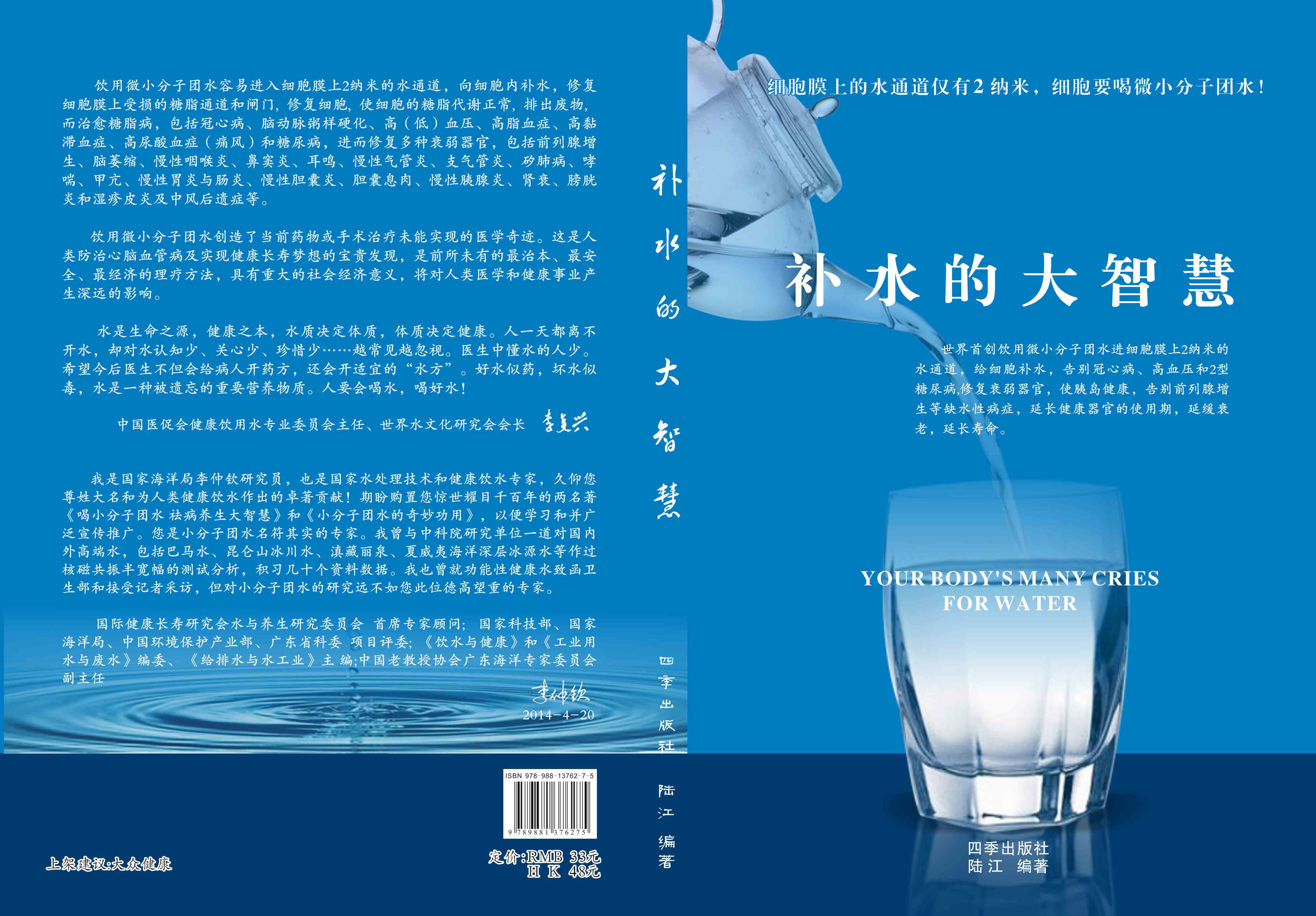 ----幾千年來,人們感到口渴才喝水,誤認(rèn)為口渴是唯一的缺水信號,使喝水量偏少。很多人只知道補(bǔ)血補(bǔ)氣補(bǔ)腎補(bǔ)鈣補(bǔ)硒,而不知補(bǔ)水,逐漸使許多器官缺水,包括皮膚、動(dòng)脈、氣管、膽囊、腸胃、骨關(guān)節(jié)、腎臟、前列腺和胰島缺水,以致患冠心病、高(低)血壓和糖尿病等缺水性病癥。美國F·巴特曼醫(yī)學(xué)博士寫有《水是最好的藥》一書很受歡迎,我國2007年譯成中文版,論述人體缺水引起許多病癥,他指導(dǎo)3000多患者喝水治愈了哮喘、胃炎和高血壓等病癥。而我是從2000年起,讓患者飲用微小分子團(tuán)水,因?yàn)槿菀走M(jìn)細(xì)胞膜上2納米的水通道,治愈了許多缺水性的病。我跟蹤調(diào)查14年,發(fā)現(xiàn)凡是認(rèn)真飲用和合理膳食,可治愈冠心病、高(低)血壓和2型糖尿病與衰弱器官并發(fā)癥及中風(fēng)后遺癥。高血壓患者飲用2~5個(gè)月,癥狀消除,不再服藥,逐漸逆轉(zhuǎn)至消除動(dòng)脈粥樣硬化,血壓正常穩(wěn)定,治愈了高血壓;冠心病人飲用3~5個(gè)月,消除心絞痛、房顫等癥狀,不再服藥,一年左右心電圖正常,經(jīng)冠狀動(dòng)脈造影掃描表明冠脈內(nèi)無粥樣斑塊,真正治愈了冠心病;2型糖尿病人飲用3~10個(gè)月停藥,血糖尿糖正常,糖尿病痊愈。并且使前列腺增生、慢性咽喉炎、鼻竇炎、耳鳴、慢性氣管炎、支氣管炎、哮喘、矽肺病、慢性胃腸炎、膽囊炎、胰腺炎、腎衰、膀胱炎、風(fēng)濕性關(guān)節(jié)炎、便秘、痔瘡和濕疹皮炎等不藥而愈,而無需終生服藥。飲用微小分子團(tuán)水治愈的是長期吃藥治不好的病,彌補(bǔ)了幾千年來醫(yī)藥的欠缺,成為人類健康的寶貴資源。