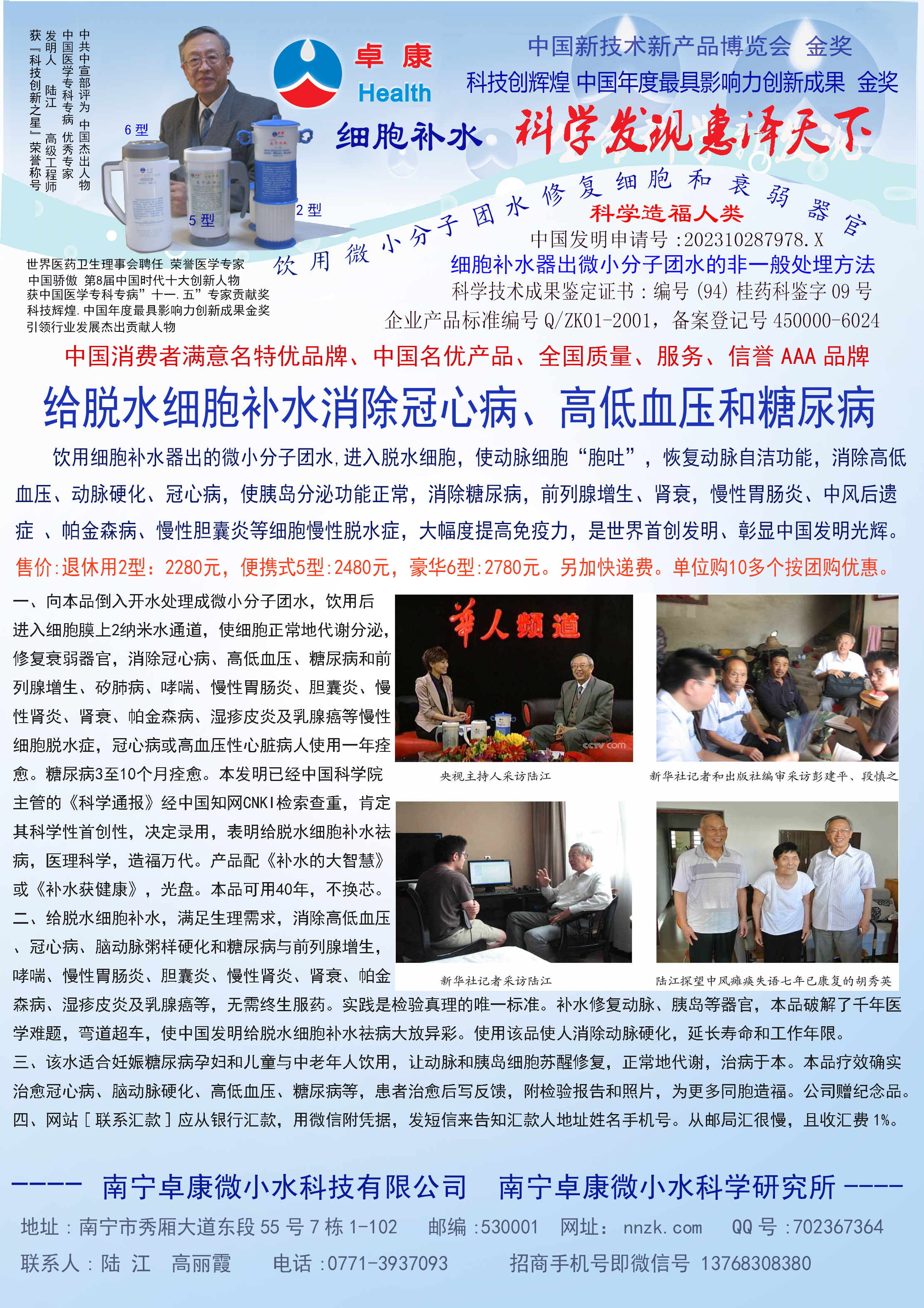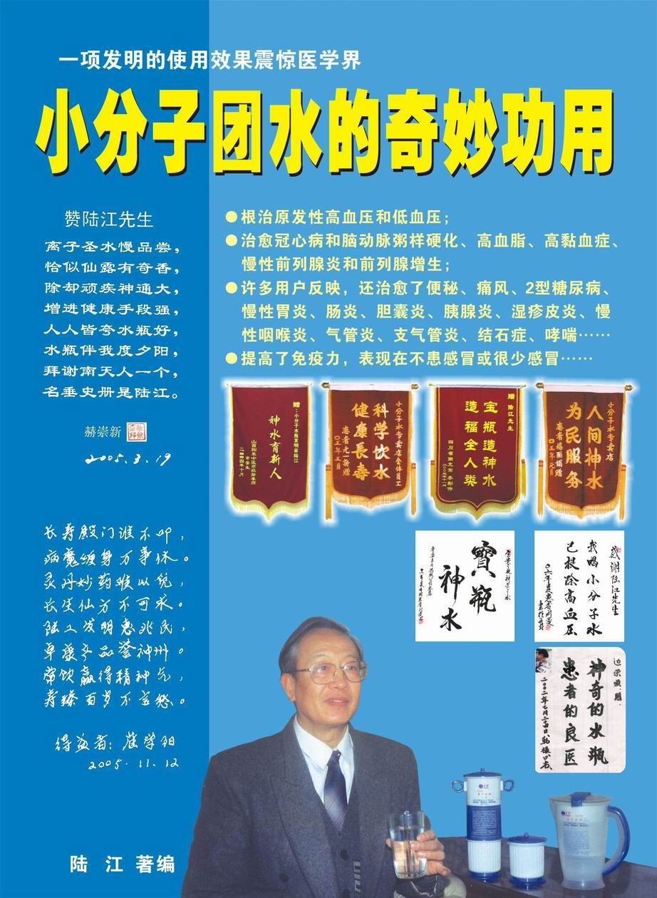人類幾千年來患以上病癥需終生服藥,幾十年也不能治愈。可是我國南寧的高級工程師陸 江,于1990年想根治高血壓,研究發(fā)明了離子水瓶,處理出微小分子團(tuán)水供飲用,經(jīng)過醫(yī)院臨床試用和專家鑒定,1999年獲中國發(fā)明專利權(quán),產(chǎn)品于2000年投放市場后一直跟蹤調(diào)查,據(jù)全國各地用戶反饋:祛除了高低血壓、糖尿病和冠心病,并使前列腺增生、咽喉炎、鼻竇炎、慢性氣管炎、支氣管炎、矽肺病、哮喘、慢性胃炎、腸炎、慢性膽囊炎、慢性腎炎、腎衰、膀胱炎、便秘、痔瘡、風(fēng)濕性關(guān)節(jié)炎和濕疹皮炎及中風(fēng)后遺癥等病癥不藥而愈。為什么喝微小水能治20多種病?陸 江從1991年德國科學(xué)家發(fā)現(xiàn)細(xì)胞膜水通道僅為2納米獲得啟發(fā),認(rèn)為多種器官患病是因細(xì)胞脫水,不能正常代謝和分裂增殖,才使器官細(xì)胞減少致衰弱萎縮而形成細(xì)胞缺水性病癥。22年來的實(shí)踐有力地支持了“細(xì)胞脫水致病”這一重要論點(diǎn),表明喝微小水可滿足細(xì)胞的生理需求,補(bǔ)水就能祛病,是生命科學(xué)新亮點(diǎn)。