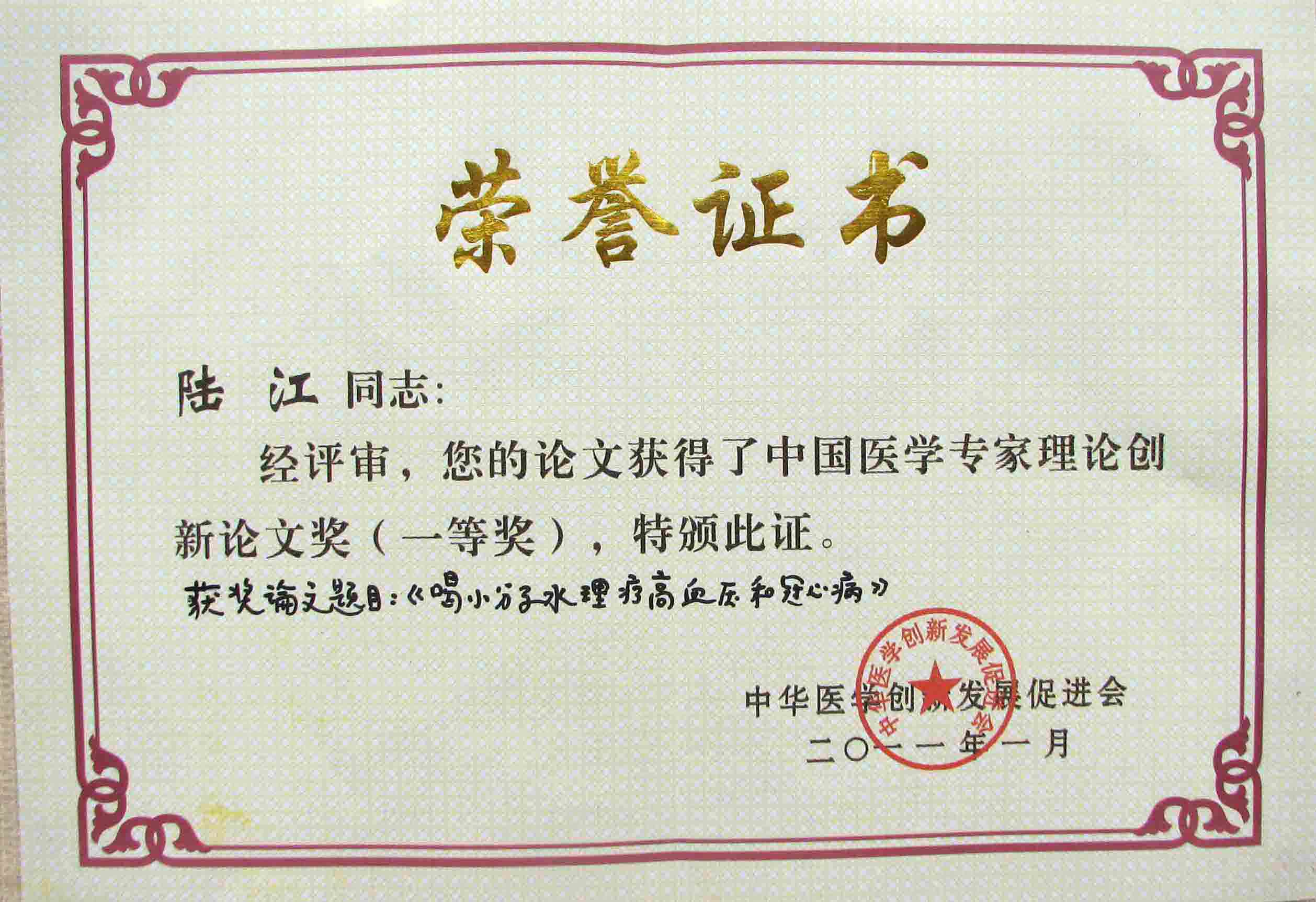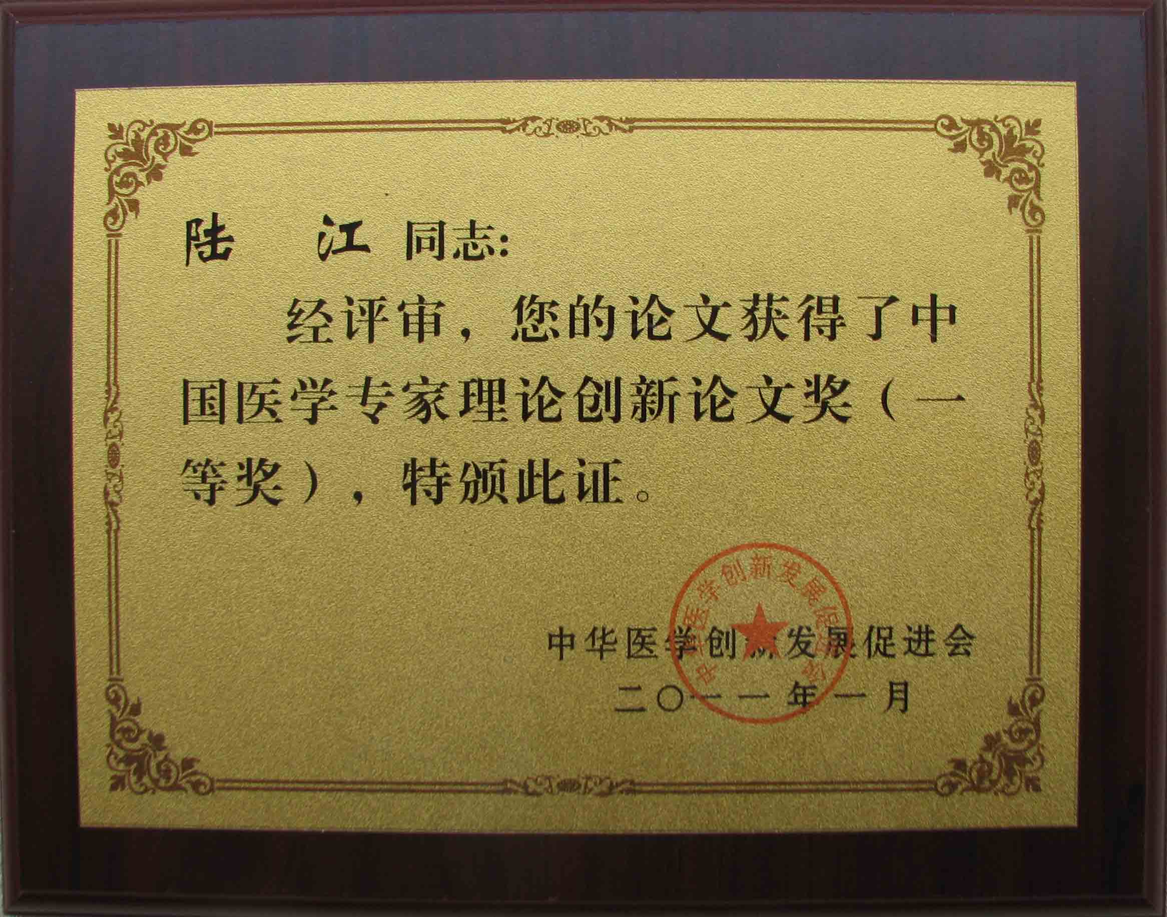 陸江的論文獲一等獎(jiǎng)榮譽(yù)證書-- 陸江論文獲創(chuàng)新論文獎(jiǎng)牌